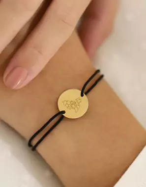 En fonction de l’événement pour lequel vous offrez le bracelet, vous pouvez le choisir sur une chaîne en or (pour un baptême, une communion) ou sur un cordon de couleur réglable par un nœud coulissant (anniversaire, rentrée scolaire). Le médaillon central sur lequel est gravé le dessin est proposé dans différentes formes : étoile, rond, cercle, carré, cœur… vous permettant une variété infinie de déclinaisons. Les bracelets sur chaîne ont une taille standard, 14 cm, avec un anneau intermédiaire à 12 cm pour pouvoir l’ajuster au poignet et permettre à l’enfant de le porter longtemps.